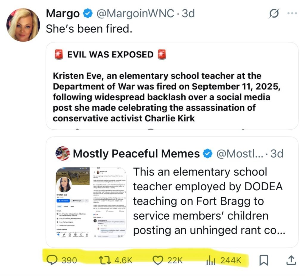 Her tweets — attacking Governor Roy Cooper as a “monster,” sharing celebratory posts about firings, and reposting memes framing Kirk as a martyr — routinely reach hundreds of thousands of views. But her influence extends beyond the screen.